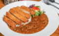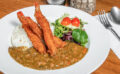 A hamburger steak, 2 pcs of deep fried breaded prawns